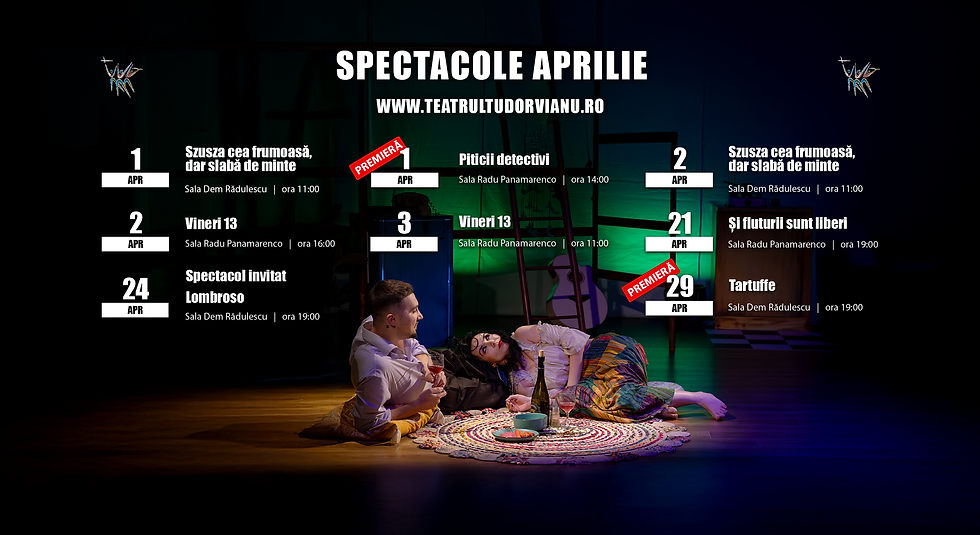 Teatrul Tudor Vianu vă invită în luna aprilie la o serie de spectacole pentru toate vârstele, de la povești pline de haz pentru cei mici, la comedii savuroase și premiere mult așteptate.
